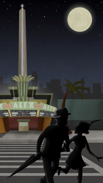 I've spent the last couple of days with my Uncle and Aunt in LA. With them as guides I've been discovering my family history, I've seen the house where my Uncle and my Dad grew up, their schools and the neighborhood. A highlight was the Alex Theatre in Glendale, a gorgeous Art Deco place which is where my grandparents met in the 1930s! I was inspired to draw this, which is perhaps my grandparents after a date. Is it creepy to imagine your granparents on a date? Hmm.